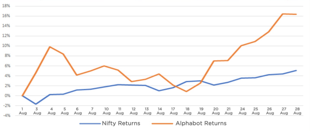Nifty gave a positive return of 2.88% during the month as shown above in the chart. However, Alphabot's algo trading easily outperformed the NIFTY returns to achieve returns of 16.32% for its investors.